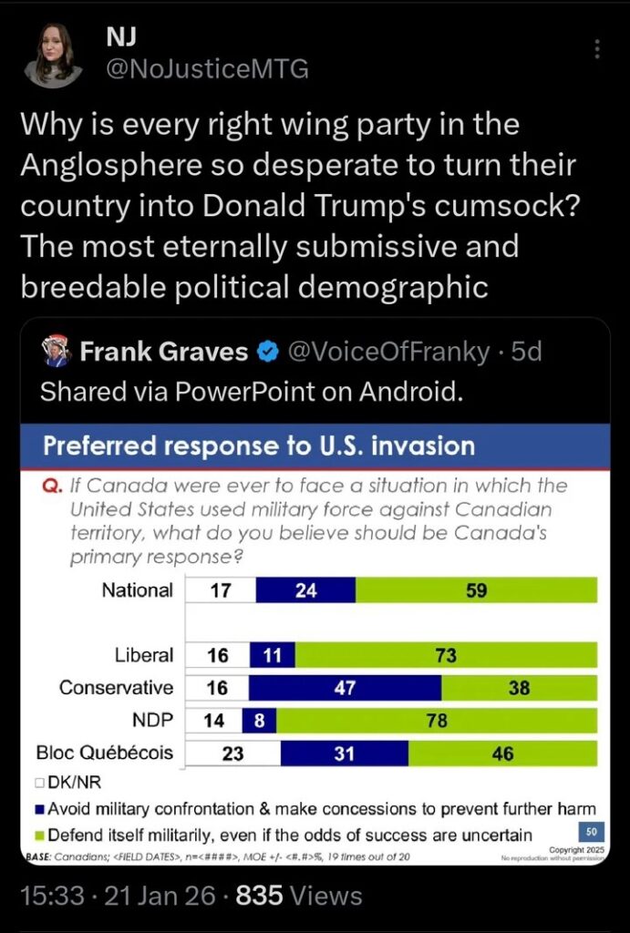 That was the survey question. At least 47% of conservatives polled said surrender and give them more. Avoid military confrontation and make concessions. The Bloc, Canada’s separationist party had more members who appreciate and believe in Canada’s sovereignty than the Conservative Party of Canada.